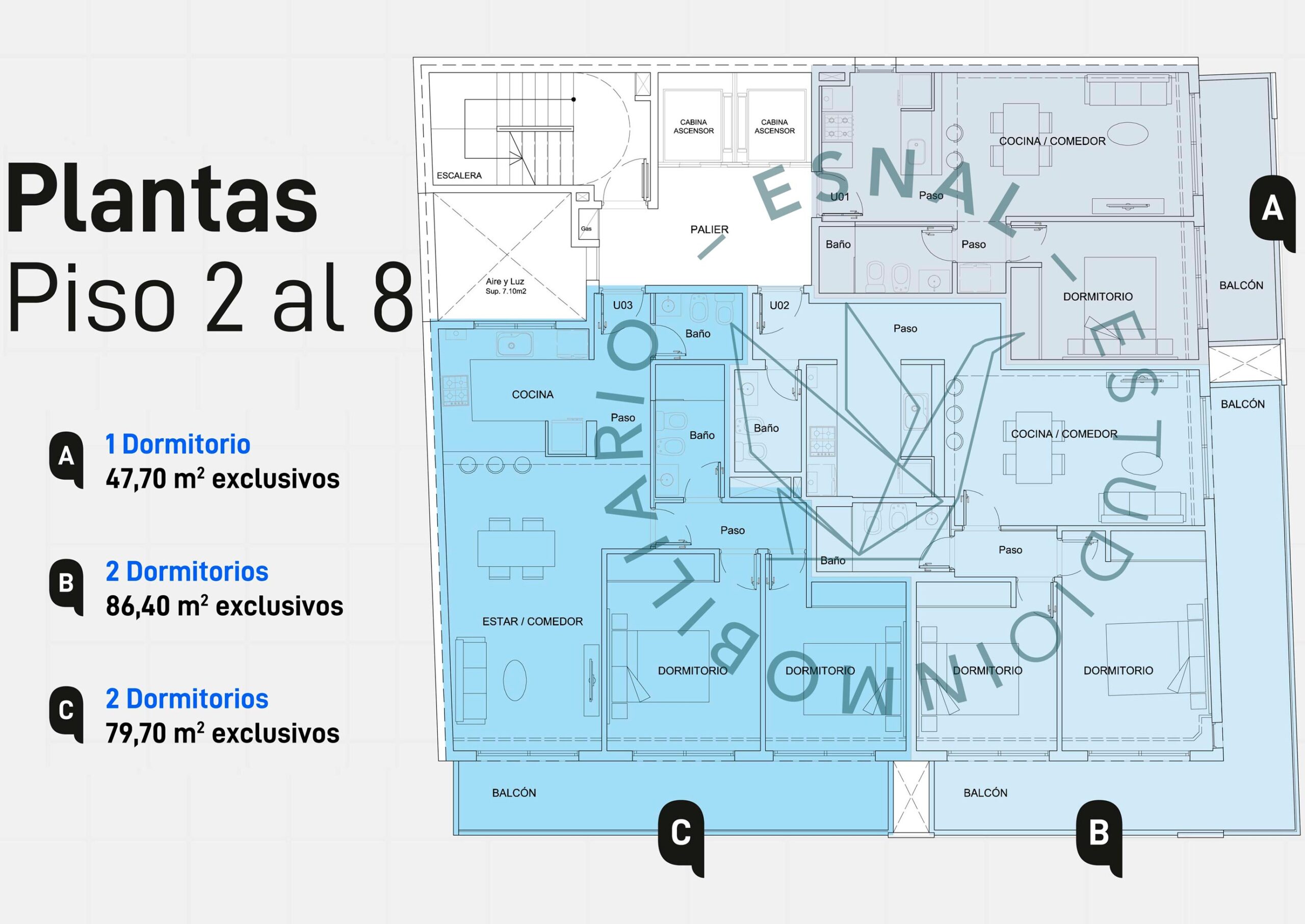 Unidades tipo semipiso van de los 73 m2 a los 86 m2 exclusivos, living comedor con cocina integrada, balcón al frente, paso distribuidor, 2 baños y dormitorios con placard.
